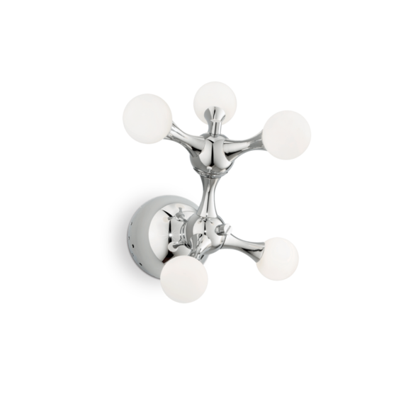 Арматура из хромированного металла. Элементы в соединении вращающие по вкусу. Рассеиватель из белого дутого матового стекла доступен в версиях: диаметр 60 см и диаметр 15 см.