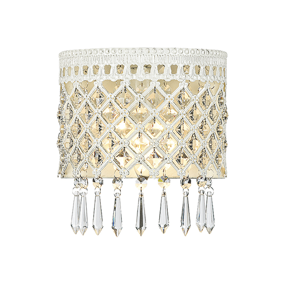Светильник изготовлен из металла белого цвета с золотой патиной, хрустальные подвески.