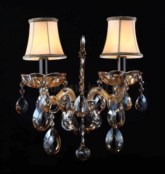 Арматура светильника сделана из металла, хромированная. Плафоны из текстиля, кремого цвета. Подвески из дымчатого хрусталя.