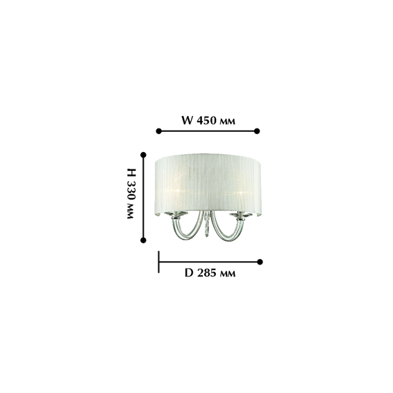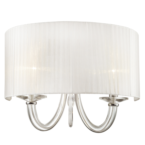 Арматура изготовлена из хромированного металла, рожки стеклянные, стекло выдувное, хрустальные подвески, плафон из белой органзы.