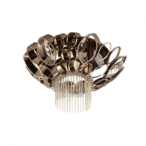 Каркас изготовлен из металла, декоративные элементы - кристаллы Сваровски и подвесные цепочки из никеля. Доступен в следующих цветовых вариантах отделки: светлое золото, чистая сталь, полированная слоновая кость, черный баклажан, черный никель.