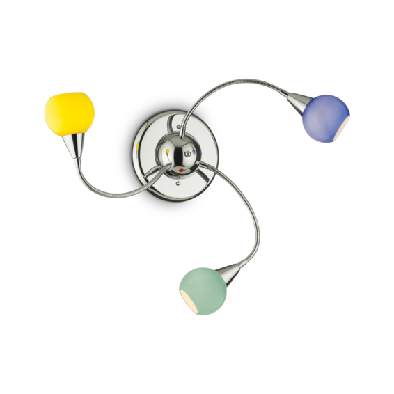Арматура из хромированного металла и гибкими рожками. Рассеиватель из прозрачного дутого стекла Pуrex с отшлифованной внутренней частью. Цветные рассеиватели из дутого облицованного стекла.