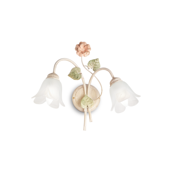 Арматура из металла ручной работы, окрашенная вручную в античном белом цвете с золотистыми отражениями, розовыми и зелёными элементами. Стекла матовые.