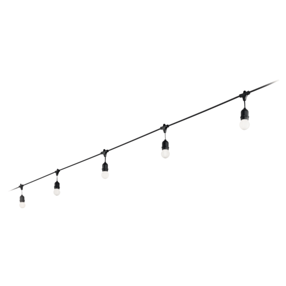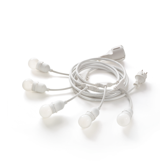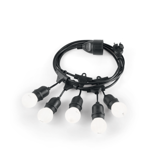 Провод с патронами и закрепляющий элемент из пластикового материала. Снабжен штепселем для улицы.