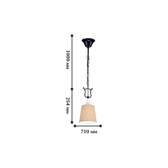 Корпус светильника и крепежные детали из темно-коричневого металла и керамики, абажуры - из ткани рогожка.