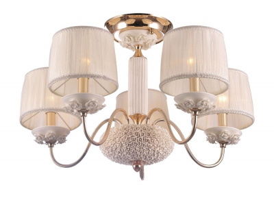 Каркас светильника изготовлен из металла с гальваническим покрытием под золото, декоративные керамические элементы, абажуры из белого текстиля.