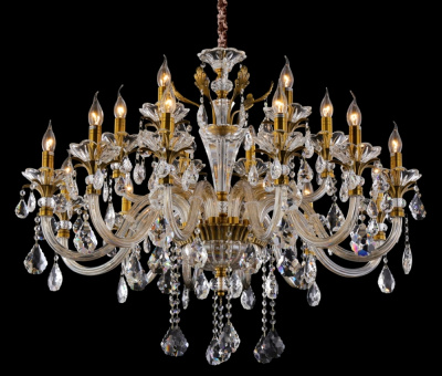 Каркас изготовлен из стекла и металла, окрашенного в бронзовый цвет, хрустальные подвески прозрачного цвета.