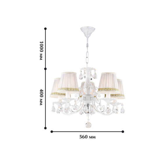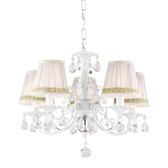 Каркас изготовлен из металла белого цвета, абажур из белой хлопковой ткани с узорной золотистой тесьмой, хрустальные подвески высшего качества.