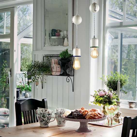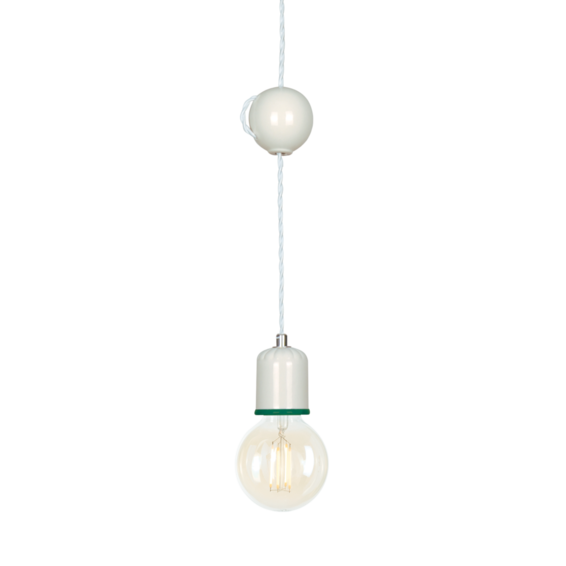 Потолочная чаша с декоративным сферическим элементом и покрывающие патроны колбы из глянцевой керамики, украшена вручную. Провод из ткани.