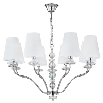 Каркас изготовлен из металла в хромированном цвете, абажур из текстиля и пластика белого цвета, хрустальные подвески прозрачного цвета.