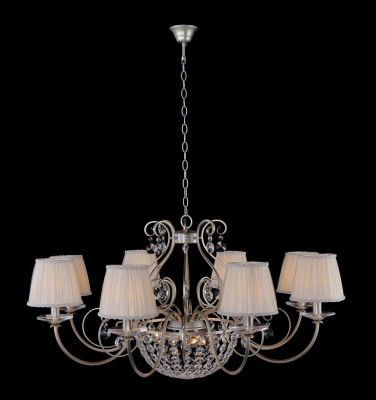 Каркас изготовлен из металла в серебристом цвете с золотой патиной, абажур из текстиля бежевого цвета, хрустальные подвески прозрачного цвета.