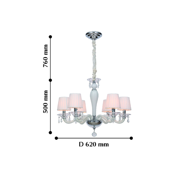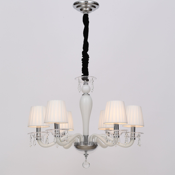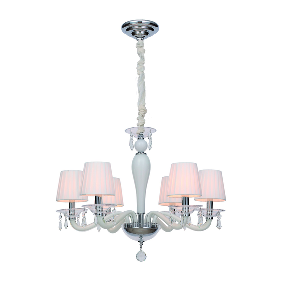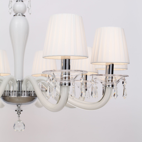 Каркас светильника из металла цвета хром, рожки и декоративные элементы из выдувного стекла белого и прозрачного цветов, абажуры из белого хлопка,подвески из хрусталя высшего качества.