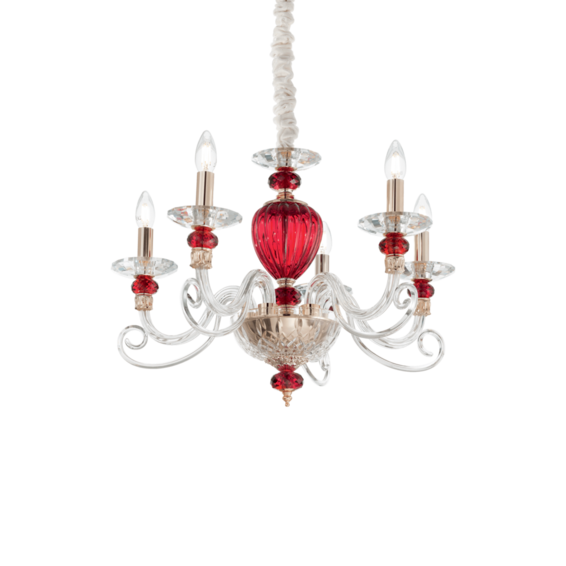 Арматура из золотистого металла. Декоративные элементы из дутого стекла и хрусталя с фацетом. Цепь скрыта бархатной тканью.