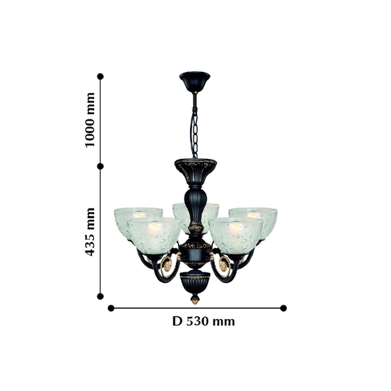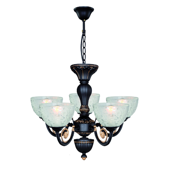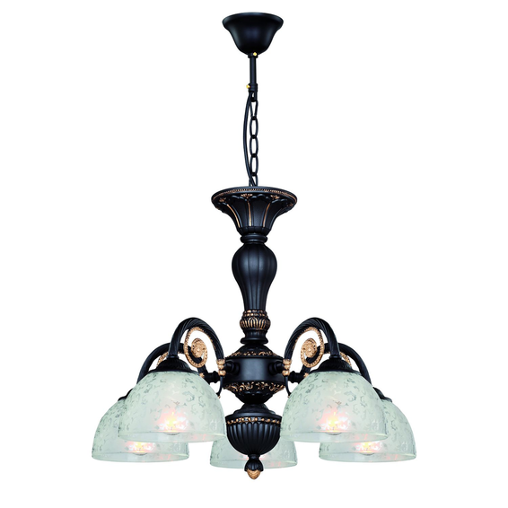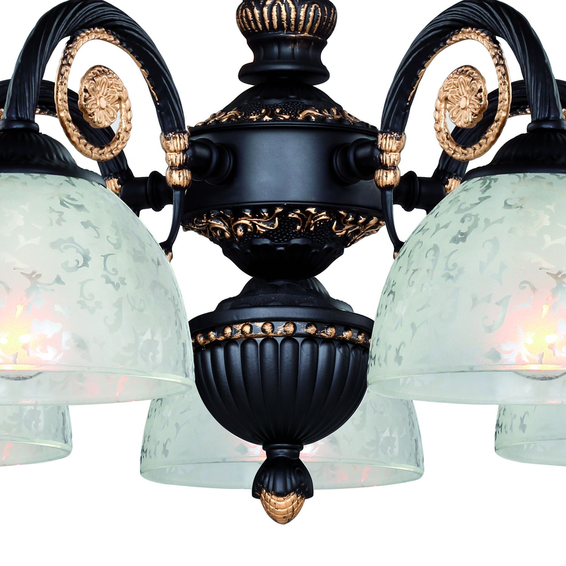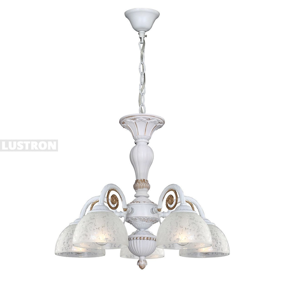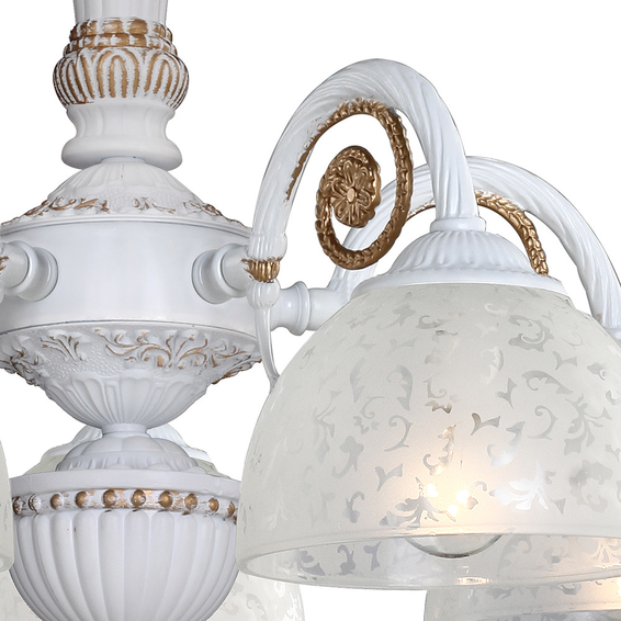 Каркас светильника из металла, окрашенный в молочно -белый цвет, с золочением декоративных элементов. Плафон из белого стекла с прозрачными узорами. Люстры с системой 2в1, убрав цепь можно подвесить к потолку. Доступен в черном цвете код- 2153-5PC.