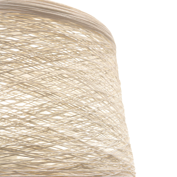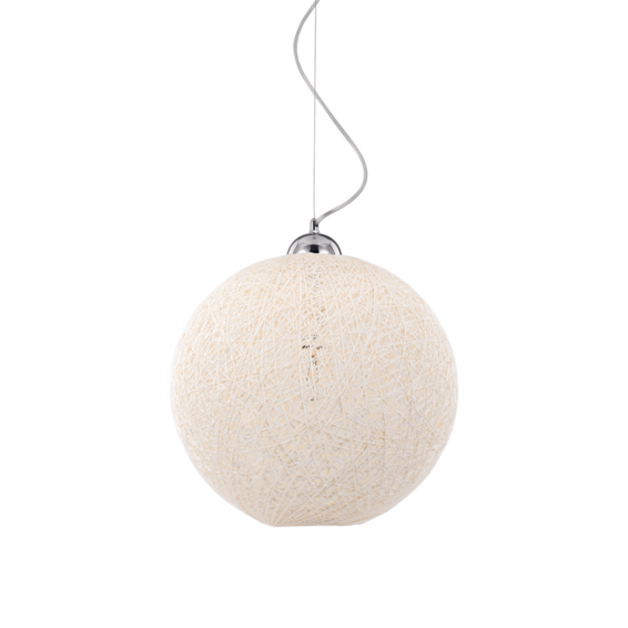 Арматура из хромированного металла. Рассеиватель из огнестойкой бечевки. Люстра в виде шара со стальным шнуром, регулируемым по длине с помощью автоматического устройства.