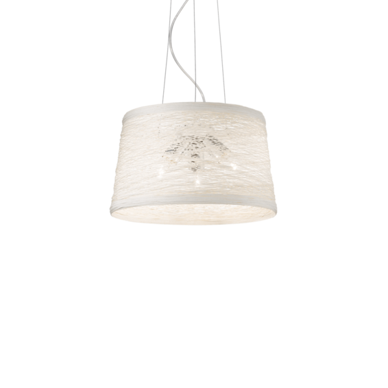 Арматура из хромированного металла. Рассеиватель из огнестойкой бечевки. Люстра в виде шара со стальным шнуром, регулируемым по длине с помощью автоматического устройства.