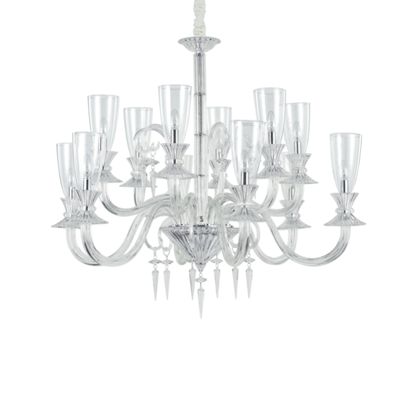 Люстра из прозрачного дутого стекла ручной работы. Арматура и детали из металла хромированного покрытия. Цепь скрыта бархатной тканью.