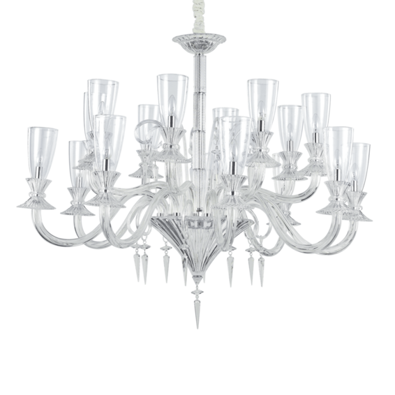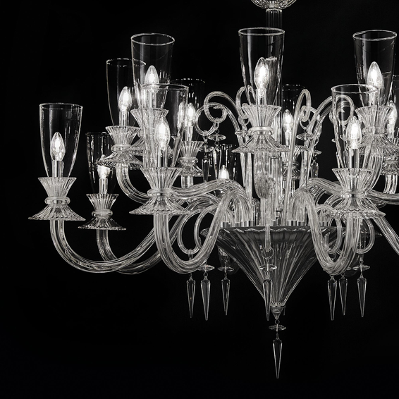 Люстра из прозрачного дутого стекла ручной работы. Арматура и детали из металла хромированного покрытия. Цепь скрыта бархатной тканью.
