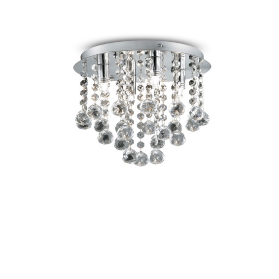 Круглая арматура и металлические патроны в хромированном покрытии. Декоративные элементы c цепочками восьмиугольных хрусталиков и круглыми подвесками из хрусталя с фацетом.