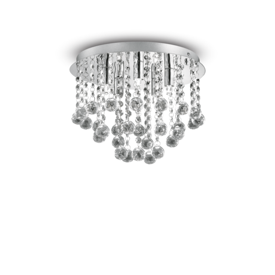 Круглая арматура и металлические патроны в хромированном покрытии. Декоративные элементы c цепочками восьмиугольных хрусталиков и круглыми подвесками из хрусталя с фацетом.