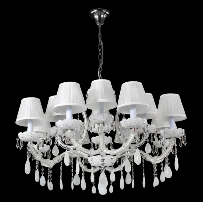 Каркас изготовлен из металла в хромированном цвете, хрустальные подвески и декор из прозрачного стекла, абажуры из текстиля в складку.