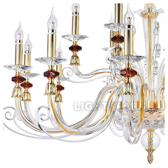 Арматура светильника сделана из металла,окрашена в золото,корпус из прозрачного стекла.Декоративные стеклянные элементы коньячного цвета.