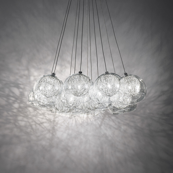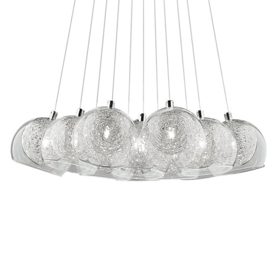 Потолочная чаша и арматура из металла с хромовым покрытием. Рассеиватели из дутого прозрачного стекла с декорациями в виде алюминиевых нитей. Подвесы с тросиками регулируемыми по длине.