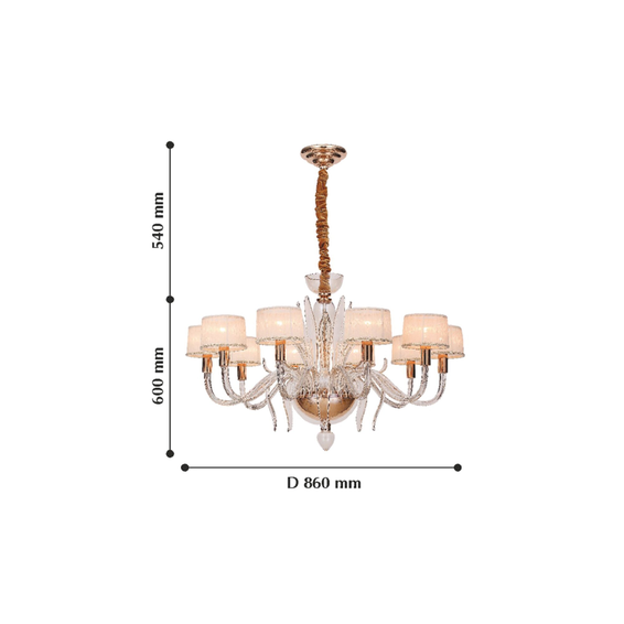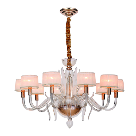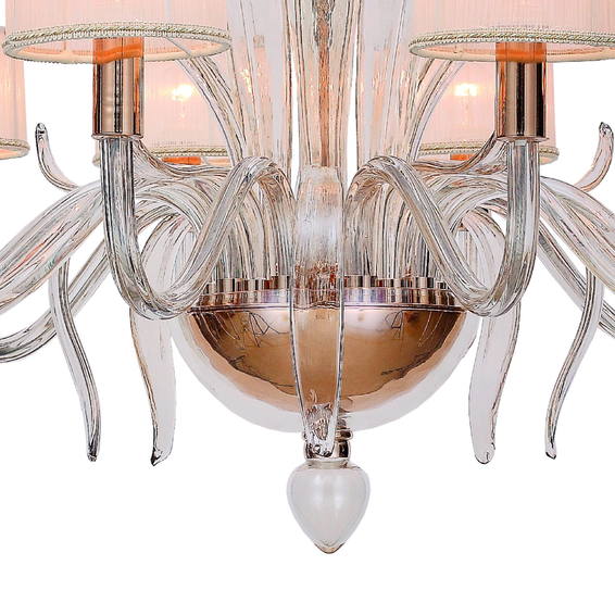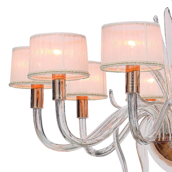 Каркас светильника из металла, покрыт гальваникой золотого цвета, стеклянные выдувные элементы цвета шампанского, абажуры из бежевой органзы.