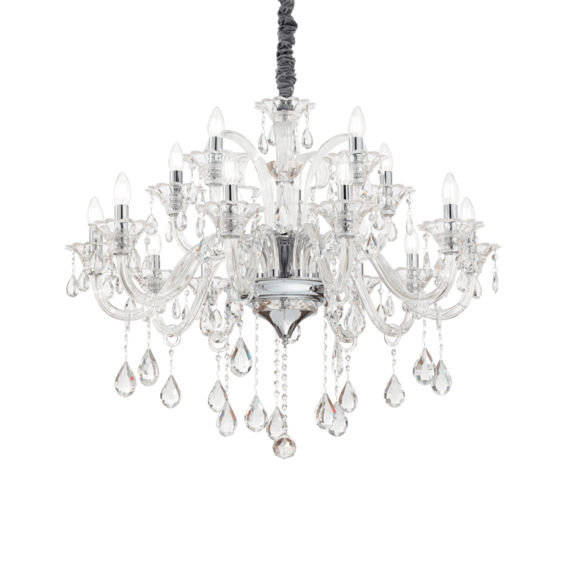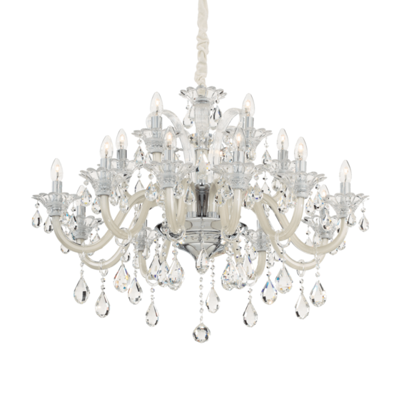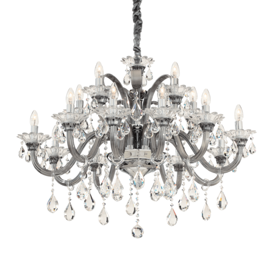 Арматура и детали из хромированного металла. Рожки из прозрачного дутого стекла или серого с серым цветом внутри или цвета слоновой кости. Подвески и декоративные элементы из прозрачного стекла и хрусталя с фацетом. Цепь скрыта бархатной тканью.