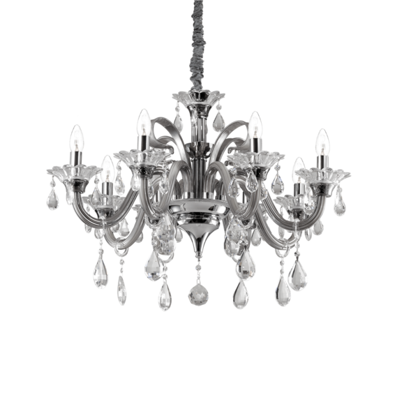 Арматура и детали из хромированного металла. Рожки из прозрачного дутого стекла или серого с серым цветом внутри или цвета слоновой кости. Подвески и декоративные элементы из прозрачного стекла и хрусталя с фацетом. Цепь скрыта бархатной тканью.