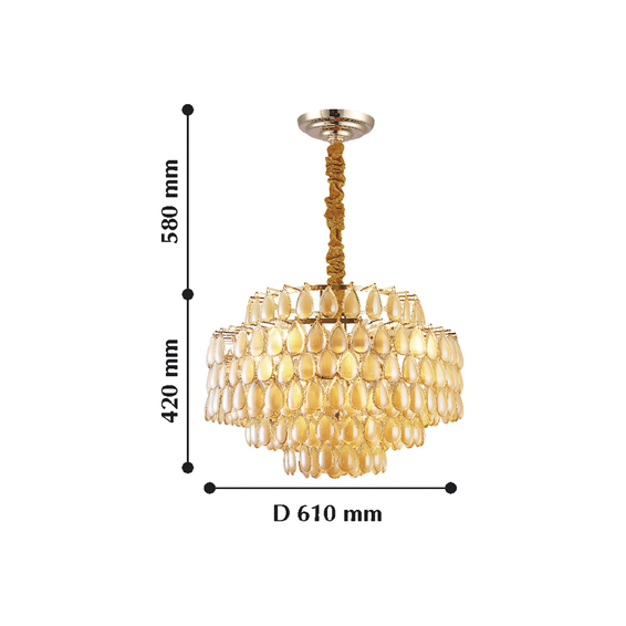 Каркас изготовлен из металла, покрытый золотой гальваникой, стеклянные подвески коньячного цвета.