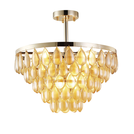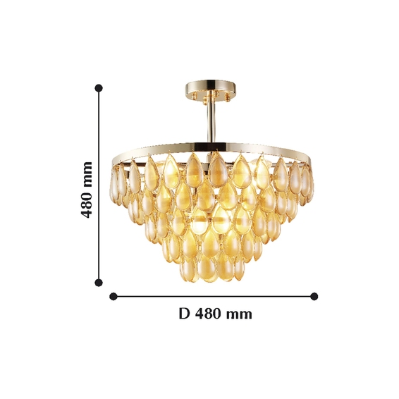 Корпус светильника из металла,покрытый золотой гальваникой. Стеклянные подвески коньячного цвета.