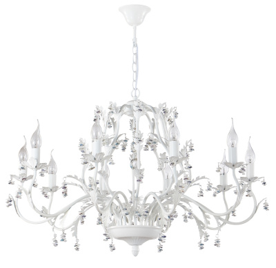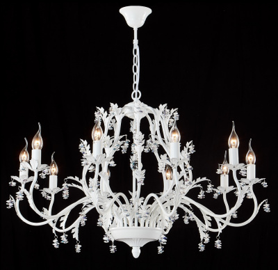Каркас изготовлен из металла, окрашенного в белый цвет, хрустальные подвески прозрачного цвета и цвета хамелеон.