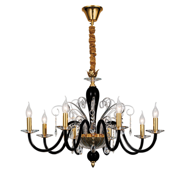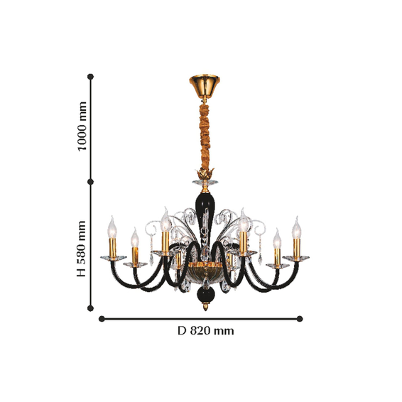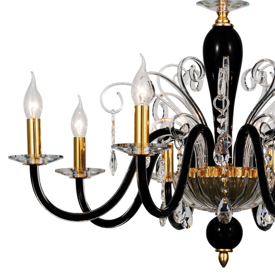 Каркас светильника из металла золотого цвета, стеклянные выдувные рожки черного цвета и декоративные элементы прозрачного цвета.