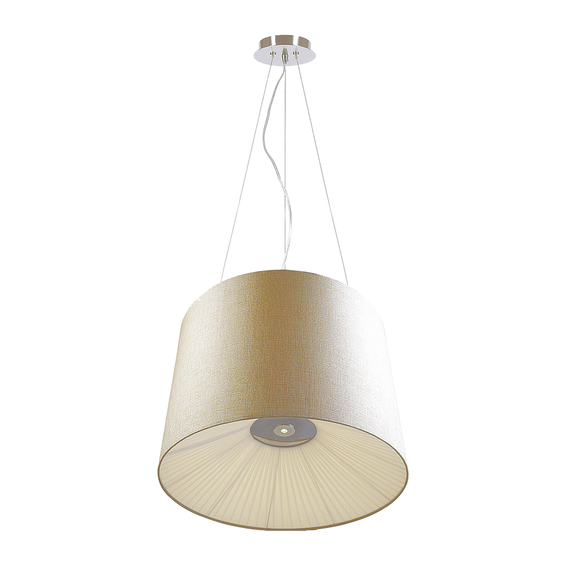 Арматура светильника сделана из металла,с хромированным покрытием.Крепежные тросы регулируются по высоте. Плафон из текстиля,бежевого цвета.