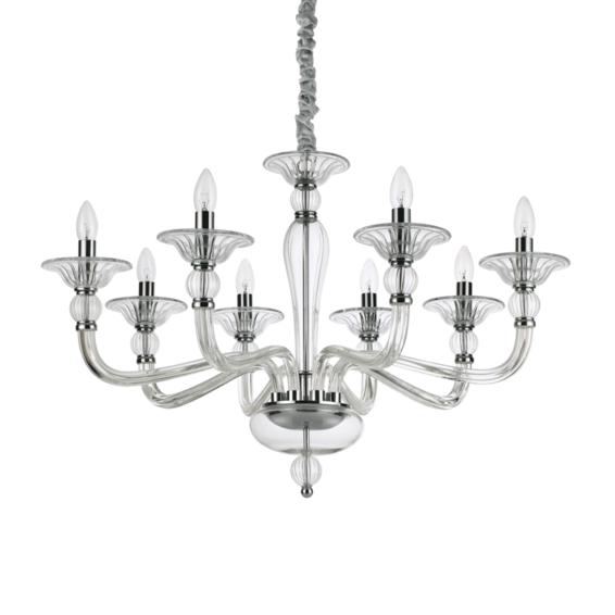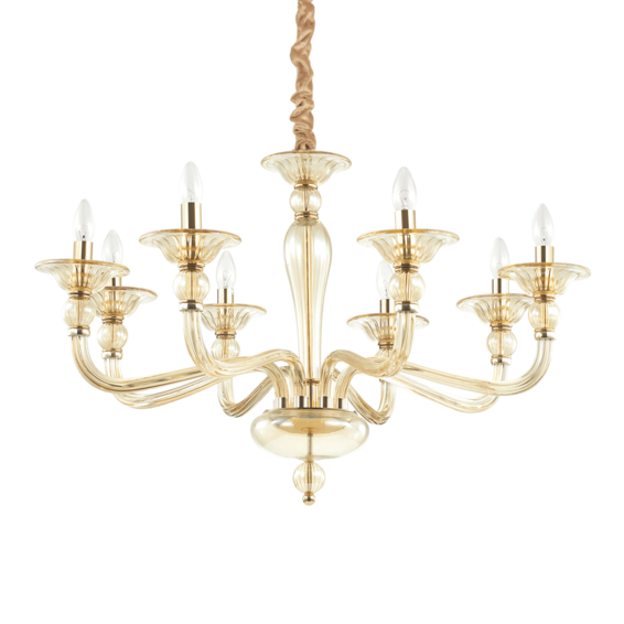 Арматура из металла в хроме или золоте. Декоративные элементы из дутого прозрачного или янтарного стекла. Цепь скрыта бархатной танью.