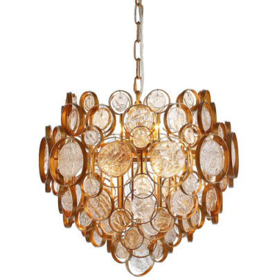 Каркас изготовлен из металла, окрашенного в матовое золото, стеклянные подвески прозрачного и янтарного цвета.