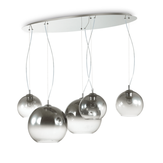 Хромированная рамка. Выдувной диффузор из прозрачного стекла с теневой хромированной отделкой. Подвески снабжены стальными тросами, регулируемыми по длине с автоматическими блокирующими устройствами.