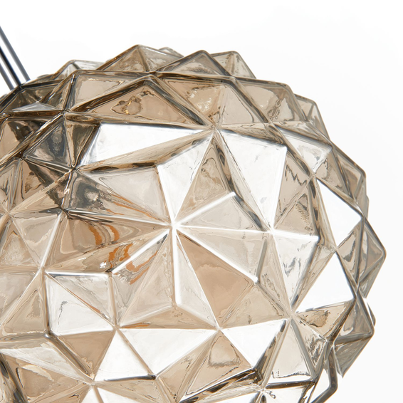 Выдувное стекло коньячного цвета с узором из множества треугольников, каркас из металла цвета хром.