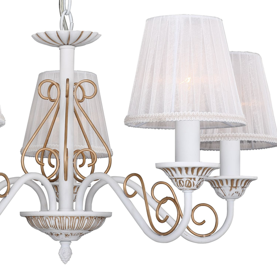 Каркас светильника из металла белого цвета с золочением декоративных элементов.Плафоны из органзы белого цвета.