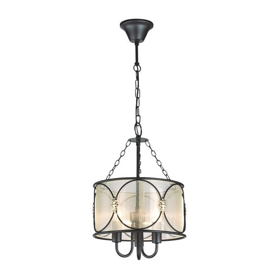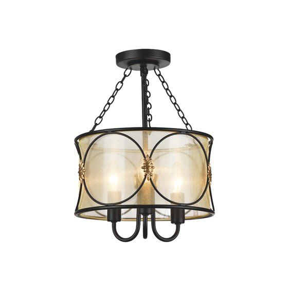 Изготовлена из металла коричневого цвета с позолоченными декоративными элементами, абажур из тонкой органзы янтарного цвета на виниле.