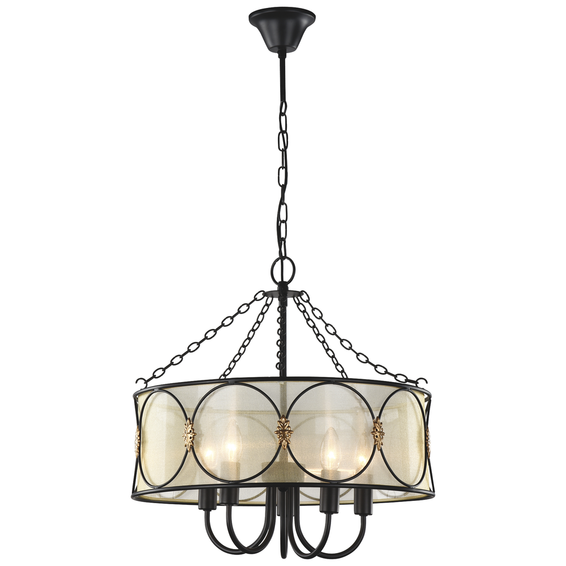 Изготовлена из металла коричневого цвета с позолоченными декоративными элементами, абажур из тонкой органзы янтарного цвета на виниле.
