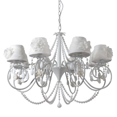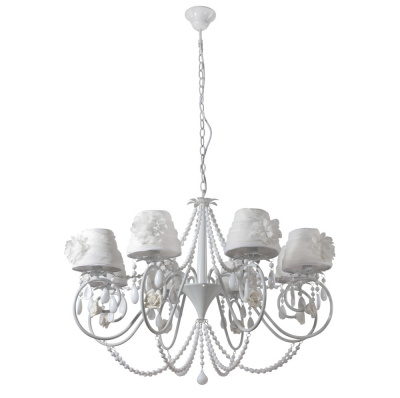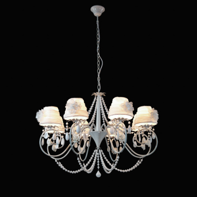 Каркас изготовлен из металла, окрашенного в белый цвет, абажуры из белого текстиля, керамические декоративные элементы.