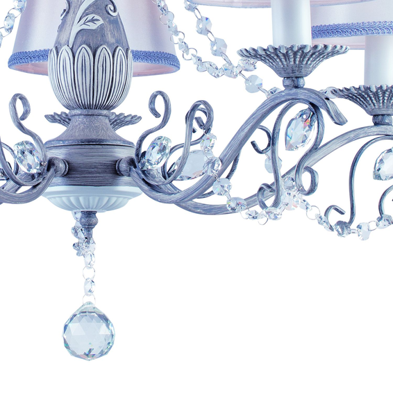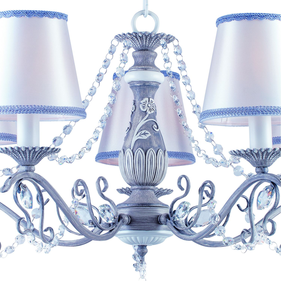 Основным цветом каркаса является серый матовый цвет, покрытый белой патиной. Абажуры из атласной ткани декорированы серой тесьмой подвесками из хрусталя.