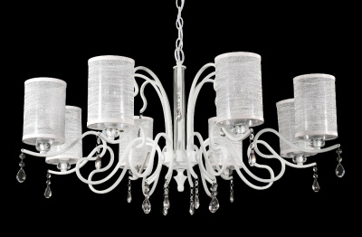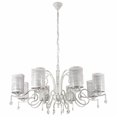 Каркас изготовлен из металла, окрашенного в белый цвет. Абажуры белого прозрачного цвета из текстиля и пластика, хрустальные подвески прозрачные.