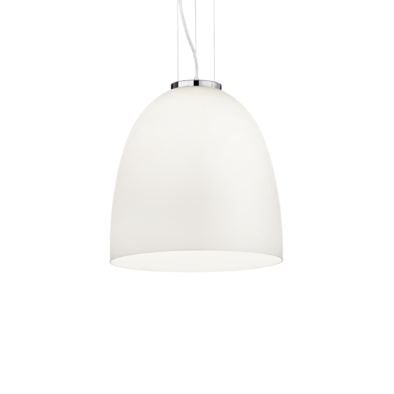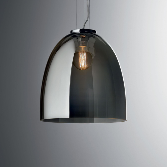 Арматура из металла с хромовым покрытием. Рассеиватель из дутого стекла. Доступна с белым матовым стеклом - EVA SP1 BIG код 077703 или с прозрачным дымчатым цветом. Стальные тросики регулируемые по длине с помощью автоматического устройства.