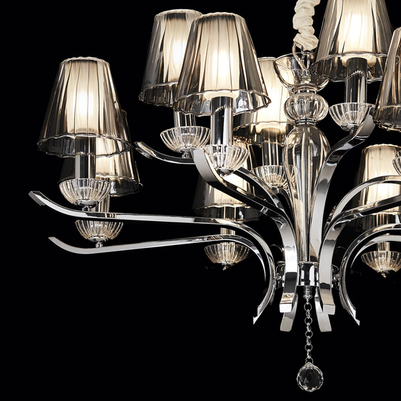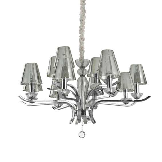 Арматура из металла в хроме. Центральный элемент и бобеш из дутого прозрачного стекла. Абажуры из серого стекла.