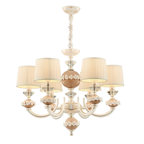 Каркас изготовлен из металла серебряного цвета, декоративные элементы из керамики бежевого цвета с белыми керамическими цветами.