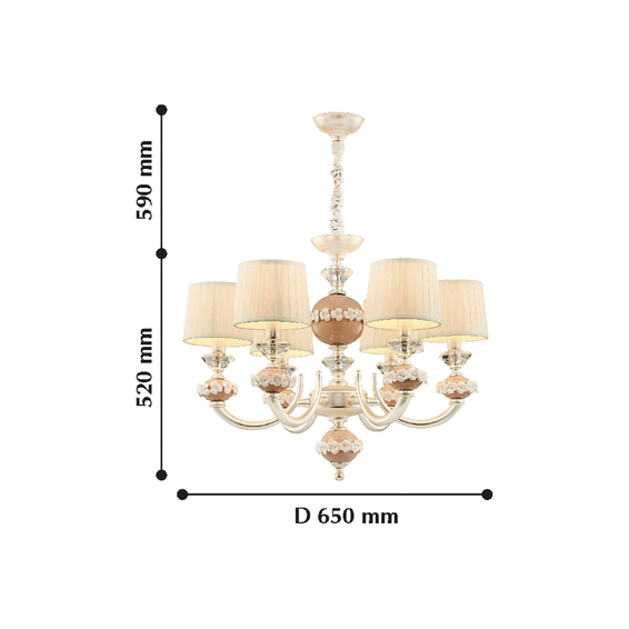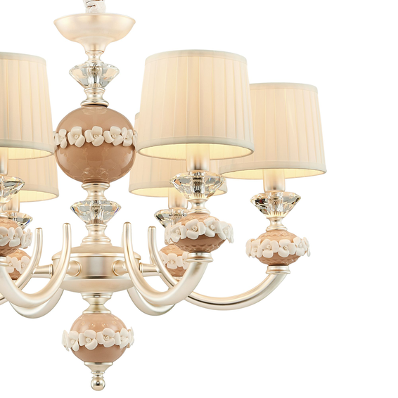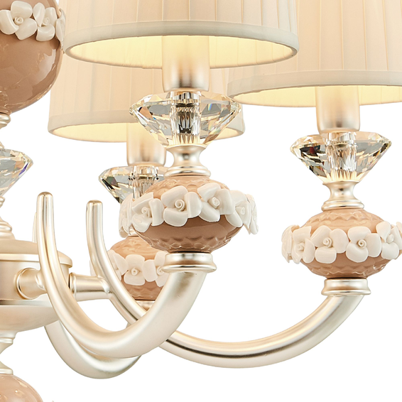 Каркас изготовлен из металла серебряного цвета, декоративные элементы из керамики бежевого цвета с белыми керамическими цветами, абажуры из белой хлопковой ткани.