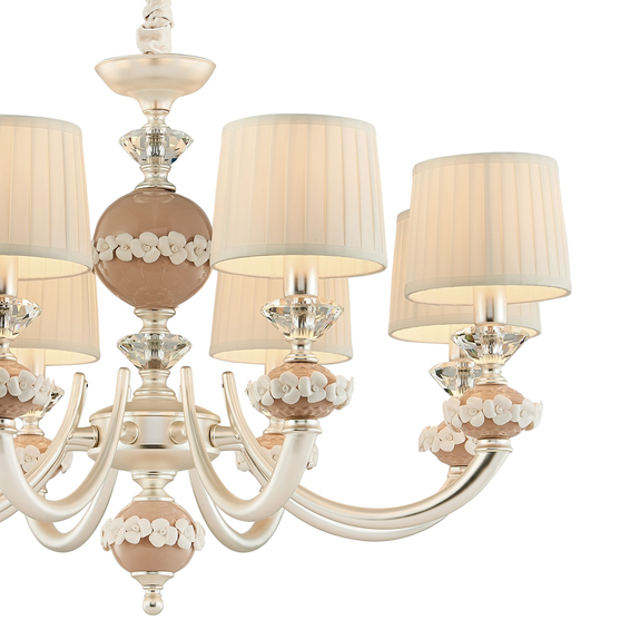 Каркас изготовлен из металла серебряного цвета, декоративные элементы из керамики бежевого цвета с белыми керамическими цветами, абажуры из белой хлопковой ткани.